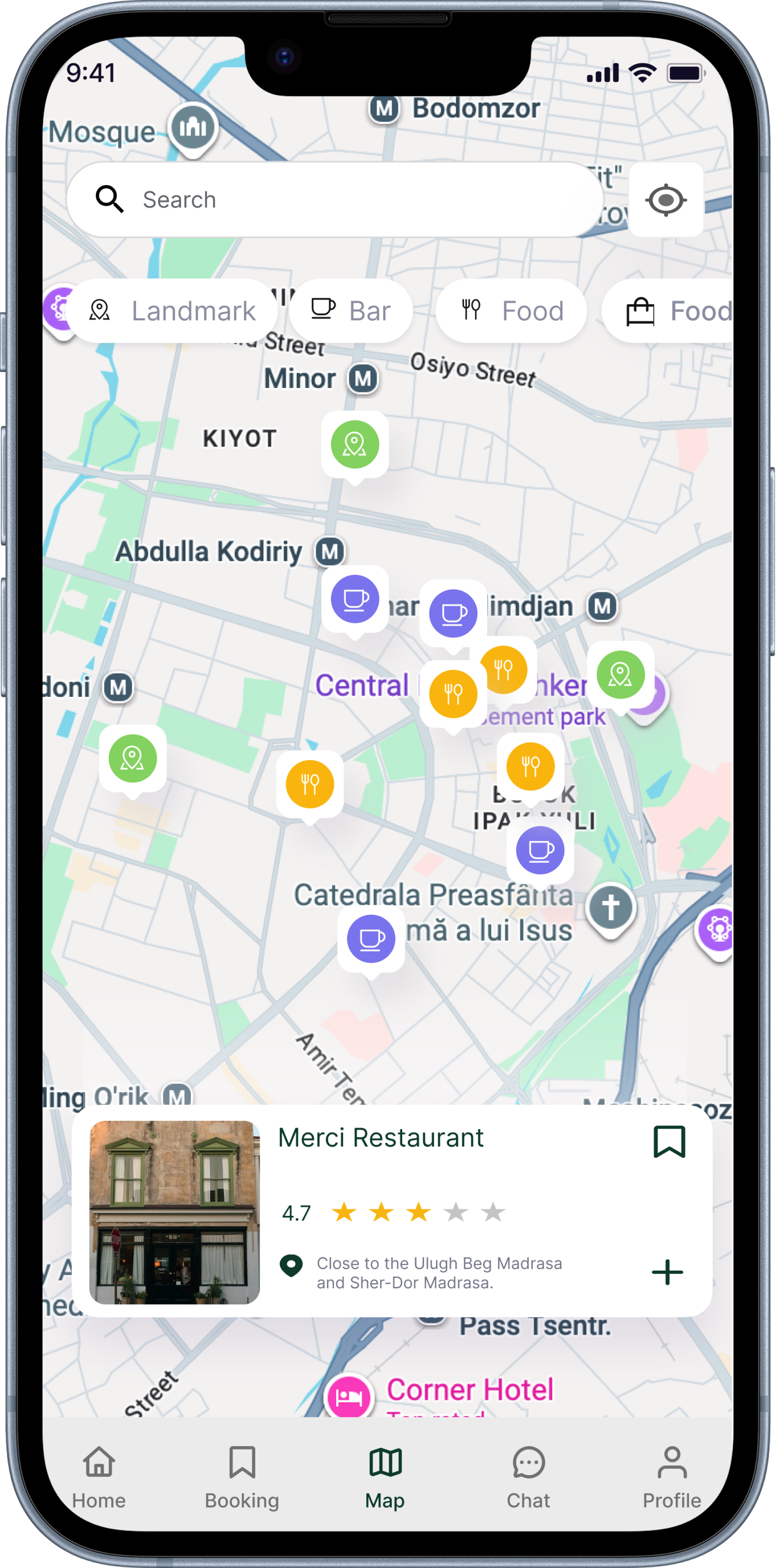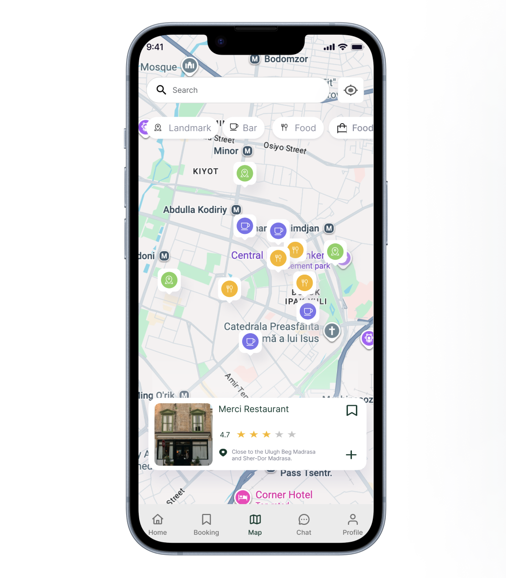 UzGo combines navigation and discovery into one screen, allowing users to search, filter, and explore places around them in real time.