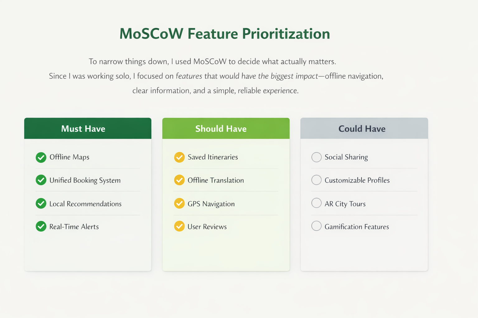 To narrow things down, I used MoSCoW to decide what actually matters.