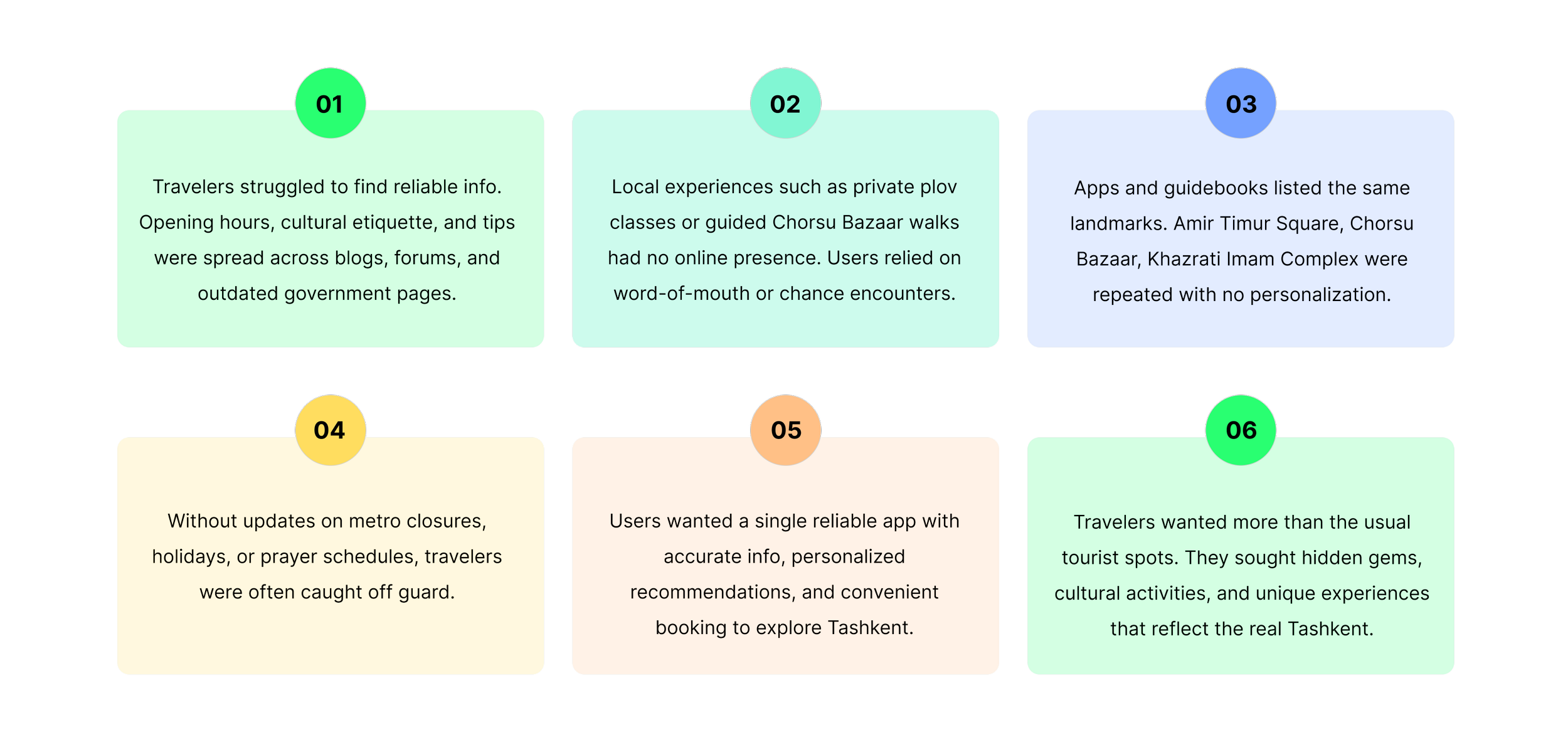 I surveyed travelers and heard all the horror stories of getting lost, missing tours, and chasing outdated info across Tashkent. It was eye-opening, exhausting, and hilarious at the same time, proof that a reliable offline app like UzGo is desperately needed.