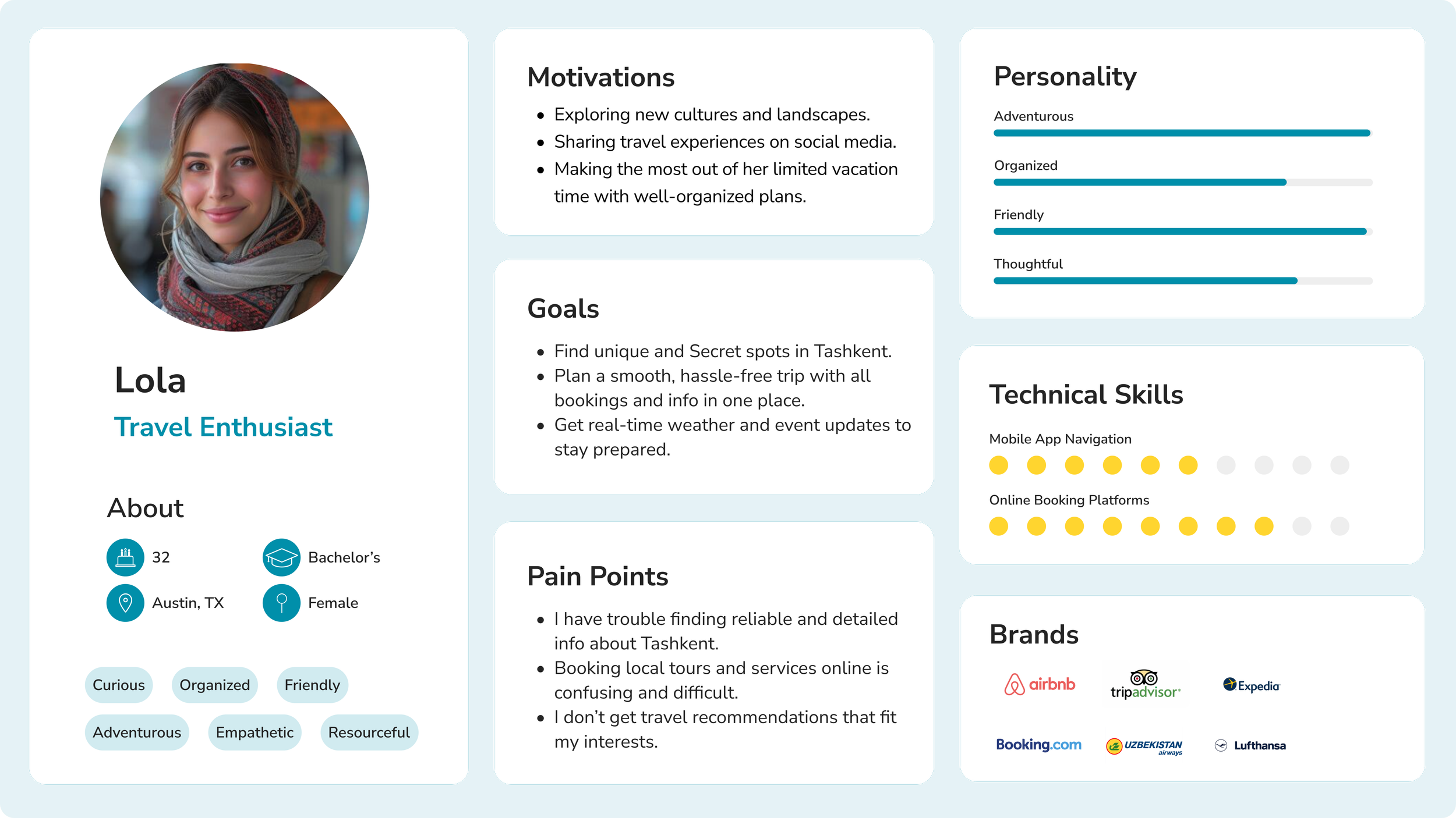 We created Lola based on insights from our surveys and interviews. The reason we created this persona is to define who our product is for and how it should serve them. From the data, we compiled her Pain Points, Goals, Motivations, and Personality traits. For example, Lola struggles to find reliable info about Tashkent, wants smooth trip planning with personalized recommendations, and loves discovering hidden gems—just like our target audience.